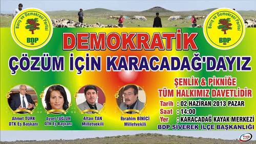 BDP Siverek ilçe teşkilatı tarafından Demokratik Çözüm için Karacadağ'dayız programına katılmak üzere DTK eş başkanları Ahmet Türk, Aysel Tuğluk, BDP Diyarbakır Milletvekili Altan Tan, Şanlıurfa Milletvekili İbrahim Binici Siverek'e geliyor. Program, 2 Haziran saat 11:00'de Çıkrık Köyü'nde, saat 14:00'te ise Karacadağ kayak merkezinde yapılacak.