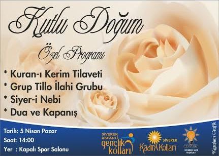 Ak Parti Siverek Gençlik Kolları tarafından kutlu doğum programı düzenlenecek. 5 Nisan 2015 pazar günü Siverek Kapalı Spor Salonunda saat 14.00'te başlayacak programa Grup Tillo İlahi Grubu katılacak.