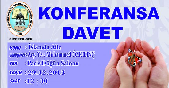 Siverek Eğitim Kültür Yardımlaşma ve Dayanışma Derneği(SİVEREK-DER) tarafından 29.12.2013 Pazar Günü Saat 12:30'da Paris Düğün Salonunda "Ailede İslam" konulu konferans düzenlenecek.Konferansa Araştırmacı Yazar Muhammed Özkılınç katılacak.
