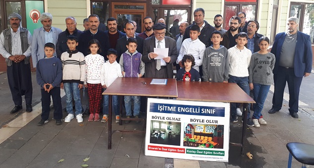 “Özel Eğitim Sınıflarına” karşı olduğunu söyleyerek açıklamasına başlayan Aymaz, “Siverek’te yüzlerce ‘İşitme Engelli’ çocuklarımız, koca bir okulda yüzlerce öğrencinin yer aldığı ve üzerinde ‘Özel Eğitim Sınıfı’ yazılı birkaç sıra, bir yazı tahtası, birleştirilmiş sınıf şeklinde, işitme engelli eğitimi alanında eğitim almamış sınıf öğretmenleri tarafından, sözde eğitim verilmeye çalışılmaktadır. Bu öğrencilerin sınıfında, eğitimde kullanılacak ne bir araç ne de bir gereç, bulunmamaktadır. Üzerinde ‘Özel Eğitim Sınıfı’ yazılarak çocukların engelleri yüzlerce öğrenciye teşhir edilip, öğrenciler aşağılanmakta ve öğrencilerin psikolojileriyle oynanmaktadır. Verilen eğitimin özel eğitimle ilgisi bulunmadığına üzülerek şahit oldum.” ifadelerini kullandı.