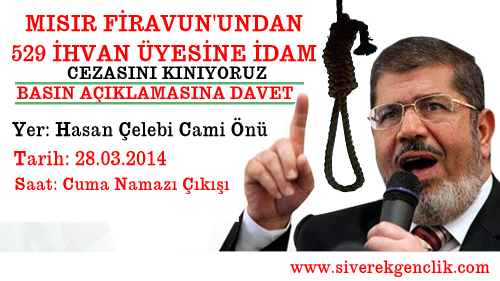 Siverek'te, Özgür-Der Siverek Temsilciliği öncülüğünde, Siverek'teki sivil toplum kuruluşları tarafından, Mısır'daki kokuşmuş askeri darbe tarafından, İhvan-i Müslimin üyelerine verilen hukuksuz idam kararı yapılacak kitlesel basın açıklamasıyla kınanacak. Basın açıklaması, 28 Mart 2014 Tarihinde, cuma namazının ardından, Hasan Çelebi Camii önünde yapılacak. Konu ile ilgili yapılan açıklamada, " Mısır'da Sisi Cuntası tarafından idam cezasına çarpıtılan müslümanlara yapılan zülmü kınamak ve yanlız olamadıklarını deklare etmek amacıyla 28 mart 2014 cuma günü, cuma namazı çıkışında, Hasan Çelebi camisinin önündeki parkta basın açıklamasına sizleride bekliyoruz.Yaşasın İslami Direnişimiz" denildi.