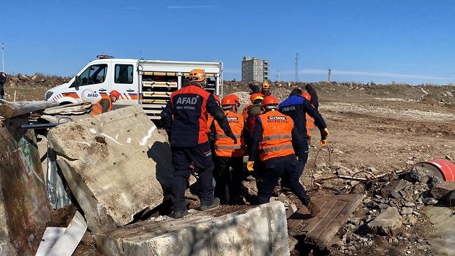 Tatbikatta dinleme yapan belediye ekipleri, enkazda canlı aradı, çıkarılan yaralılar sağlık ekiplerine teslim edildi.