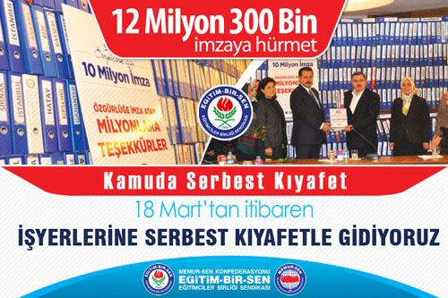 Memur-Sen Konfederasyonu kamu çalışanlarına kılık kıyafet özgürlüğü talebiyle 14 Şubat-14 Mart tarihleri arasında gerçekleştirdikleri 'Özgürlük İçin 10 Milyon İmza' kampanyasında toplanan 12 milyon 300 bin imzayı, 8 Mart Dünya Kadınlar Günü'nde Çalışma ve Sosyal Güvenlik Bakanı Faruk Çelik'e teslim etti. Memur-Sen adına konuyla ilgili açıklamalarda bulunan Eğitim Bir-Sen Siverek Temsilcisi Fikret Aslanparçası, "12 Milyon 300 bin imzanın hükümete bu konuda verilmiş dilekçe olduğunu ve gereğini yapmalarını beklediklerini" söyledi.