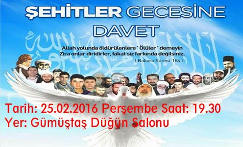 Şanlıurfa'nın Siverek ilçesinde, Peygamber Sevdalıları Platformu Üyesi Siverek İkra Sosyal Yardımlaşma ve Dayanışma Derneği tarafından şehitler ayı olarak kabul edilen şubat ayı münasebetiyle 25 Şubat 2016 Perşembe günü saat 19.30'da, Gümüştaş Düğün Salonunda "Şehitler Gecesi" isimli program düzenlenecek. Programa konuşmacı olarak Araştırmacı Yazar Sait Şahin katılacak. Programda Özlem Ajans sanatçı Bilal Güler tarafından marş ve ezgiler seslendirilecek. Dernek yöneticileri tarafından programa tüm Siverek halkı davet edildi.