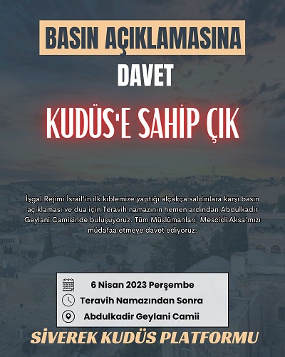 Siverek Kudüs Platformu "Kudüs'e Sahip Çık" sloganı ile Şeyh Abdulkadir Geylani Camii'nde Teravih Namazı'nın ardından basın açıklaması düzenleyerek, işgalci rejimin saldırılarını telin edecek.