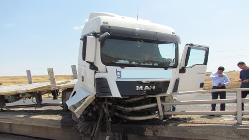 ŞANLIURFA- Alınan bilgilere göre Diyarbakır istikametinden Siverek istikametine doğru giden 63 K 6243 plakalı Ömer Şaban hâkimiyetinde bulunan TIR, Siverek girişinde seyir halindeyken lastiğinin patlaması sonucunda direksiyon hâkimiyetini kaybedip karşı şeride geçerek bariyerlere çarptı. Kazada araç sürücü hafif şekilde yaralandı. Olay yerine gelen trafik ekipleri trafik akışını kontrollü olarak sağladı. Trafik ekipleri TIR'ı çarptığı yerden çekiciler yardımı ile çekerek trafik akışını normal olarak tekrar sağladı.