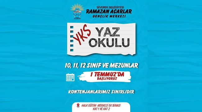 Siverek Belediyesi, üniversiteye hazırlanan gençler için ücretsiz YKS Yaz Okulu açıyor. 1 Temmuz’da başlayacak eğitim programı, öğrencilerin yaz aylarını verimli geçirmesini hedefliyor.