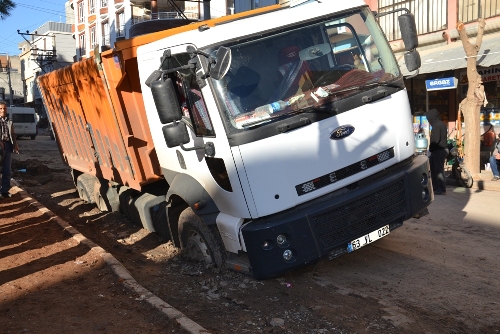Şanlıurfanın Siverek ilçesine bağlı Dicle Mahallesinde bulunan Mevlüt Korkmazoğlu Caddesinde hafriyat kamyonun geçişi sırasında yol çöktü, kamyon yolda saatlerce mahsur kaldı.